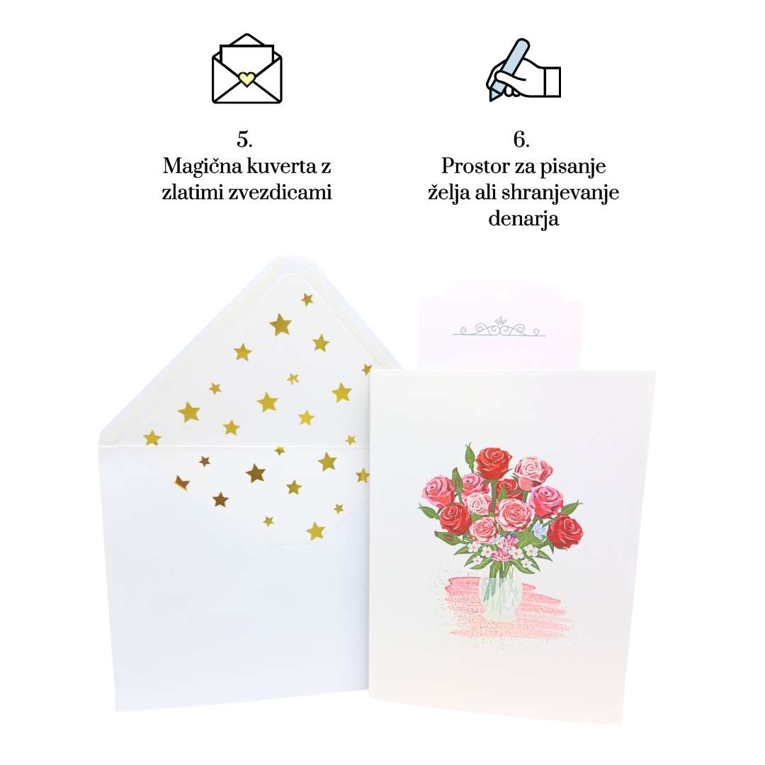 - 💌Poleg voščilnice prejmete elegantno belo kuverto z zlatimi zvezdicami in izvlečno kartico, pripravljeno za vaše osebno sporočilo.
