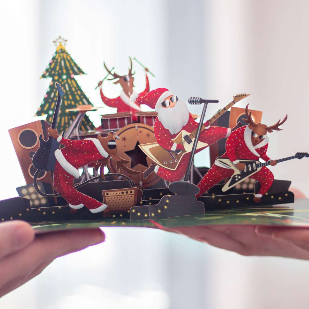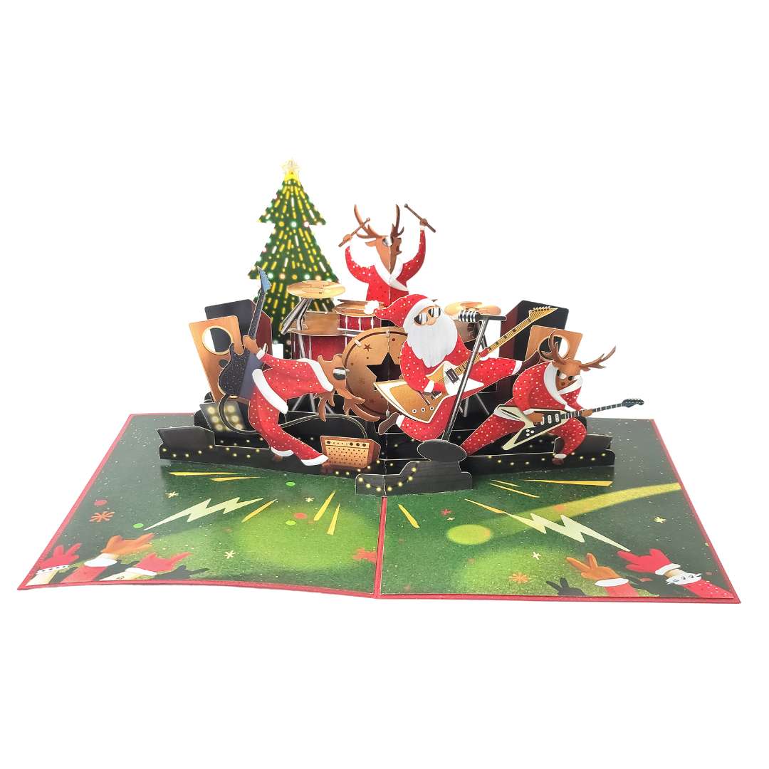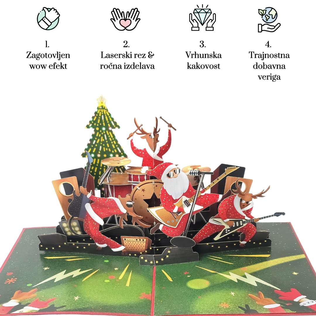🎅3D voščilnica prikazuje Božička, ki igra v bandu. Ob odprtju oživi v zabavni, igrivi podobi. Popolna za božične praznike, obdarovanje in posebne trenutke. Dodajte osebno sporočilo in ustvarite nepozaben vtis.